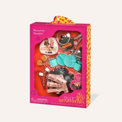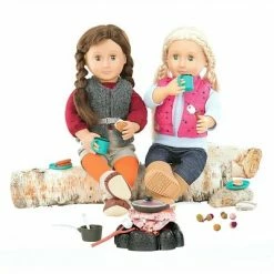 Get ready for the ultimate camping trip with the Campfire accessory set from Our Generation! This set includes a flickering bonfire, roasting sticks, marshmallows, hot dogs, sโmores, a pot, a pan, a ladle, two mugs, and two plates. Each piece is perfectly sized for Our Generation dolls (or other 18-inch dolls), bringing more personality and excitement to playtime. (Dolls sold separatley. Compatible with American Girl dolls)