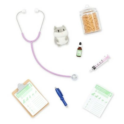 - Includes: 18-inch doll, scrubs top with cute animal prints, pleated skirt, undies, doctor’s coat, plush hamster, pair of shoes, stethoscope, clipboard, 2 medical forms, treats jar, pretend syringe, pen, and medicine bottle.