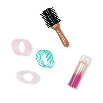 - Includes: 18-inch doll, stylist apron, dress, leggings, undies, bright pink shoes, hair dryer with sound, spray bottle, 15 colored elastics, hairbrush, 2 hair clips, storybook, and bookmark.