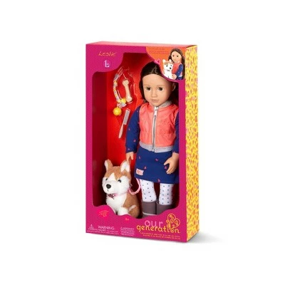 Leslie and her Husky puppy show you why dogs are actually a girlโs best friend with theย Our Generation Doll & Pet.ย Leslie is a beautiful 18-inch doll with deep brown eyes and long, straight brunette hair. She wears a perfect dog-walking outfit featuring a cozy blue dress with pink hearts, printed tights, comfy walking boots, and a zip-up vest. Whether out for a stroll in the dog park or playing fetch in the backyard, Leslie and her loyal pup have everything they need. Her puppy comes with a leash, brush, and three chew toys. This adorable Our Generation doll also makes for the perfect gift for your little one.ย