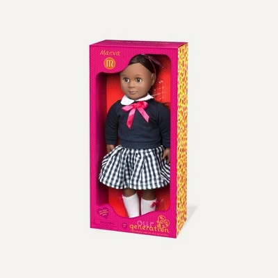 Going to school is exciting when you have great friends like the Our Generation® 18-inch doll Maeva! She has warm brown eyes that open and close, and her long, dark-brown hair is lots of fun to brush and style! Maeva is ready for another year of school fun with her friends. She wears a stylish school uniform that features a black long-sleeved pullover with a bright-pink satin bow, a plaid skirt, knee-high socks with matching pink bows, flat pink shoes, and a pretty headband. What will Maeva’s favorite subject be this year? Help her decide with the range of great Our Generation accessories like the Awesome Academy school room, and the Brilliant Bureau Desk set. (School room and Desk set sold separately. Compatible with American Girl dolls)