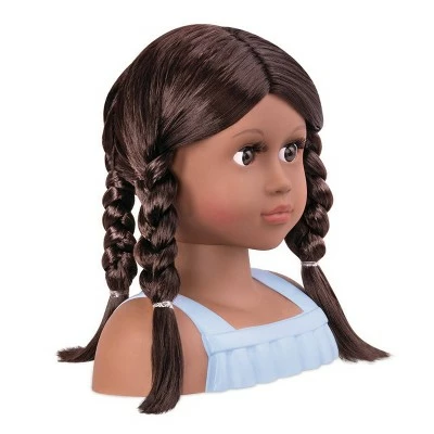 Decorate and create new hairstyles with Nessa, the 9-inch Our Generationยฎ styling head doll! Nessa has warm brown eyes and long, dark-brown hair thatโs lots of fun to brush and style! She comes with a selection of beautiful hair accessories like 2 heart-shaped hair clips, a headband with a bow, a hair brush, lip gloss, and 2 sticker sheets. These styling accessories can also be used on kids too! Nessa is the perfect styling head for testing out all your sparkling ideas โ just reach into your imagination and shine! (Accessories compatible with American Girl dolls)