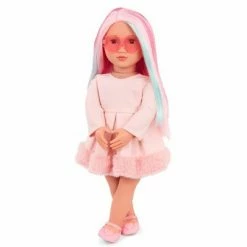 Bright styles and hair play are a blast with Rosa! Known for her sweetness and compassion, this Our Generation 18-inch doll has long, multicolored hair that’s fun to style into updos, ponytails, braids, and more! She also has a huggable soft body, beautiful brown eyes that open and close, and can rotate her neck, arms, and legs to easily change outfits during dress-up. Rosa arrives wearing an adorable long-sleeved dress with a faux-fur trim, cute heart-shaped sunglasses, and a pair of shoes with mini hearts on the toes. Her outfit features easy-open closures to quickly put on and remove, so you can mix, match, and create more fun fashion looks to pair with Rosa’s hairstyles! Collect Rosa, Veronika, and Mirabelle to complete a friendship rainbow and shine together! (Additional dolls sold separately)
